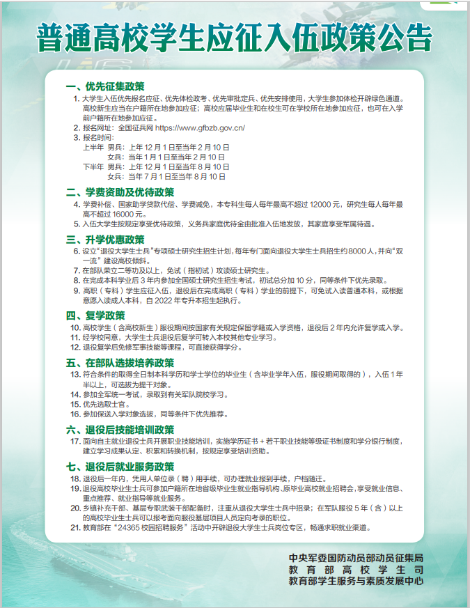 普通高校学生应征入伍政策公告